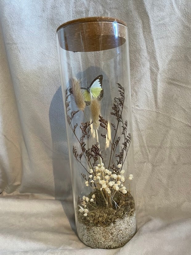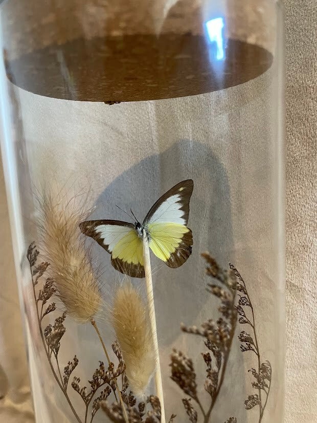 Deze prachtige vlinder is beschikbaar in zowel een gedecoreerde vaas als in een lijst met een geschilderde achtergrond.